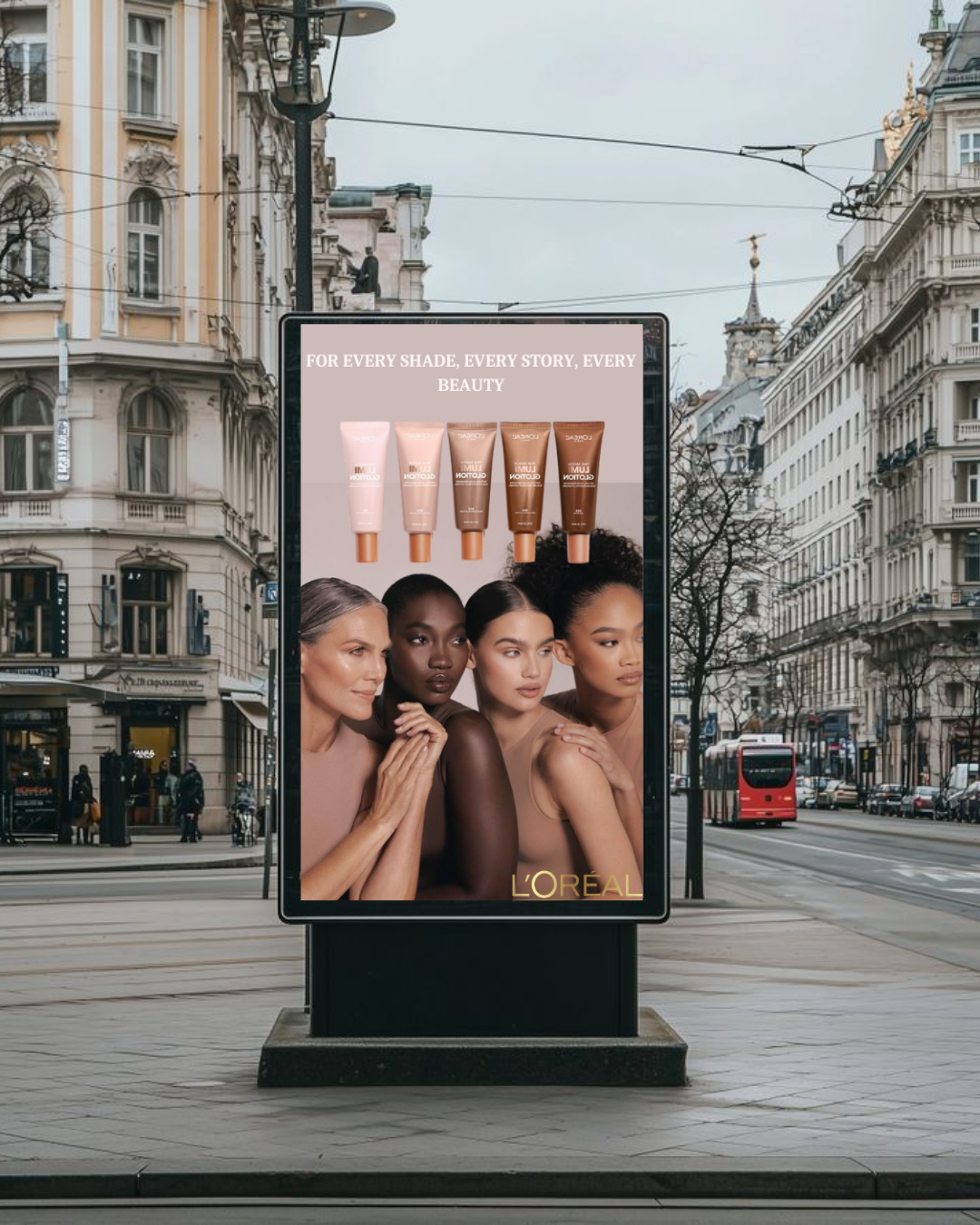 Outdoors: Em pontos estratégicos e movimentados das grandes cidades com frases inspiradoras como "For every shade, every story, every beauty", acompanhadas de imagens demonstrando a diversidade de tons do produto e dos consumidores da marca.